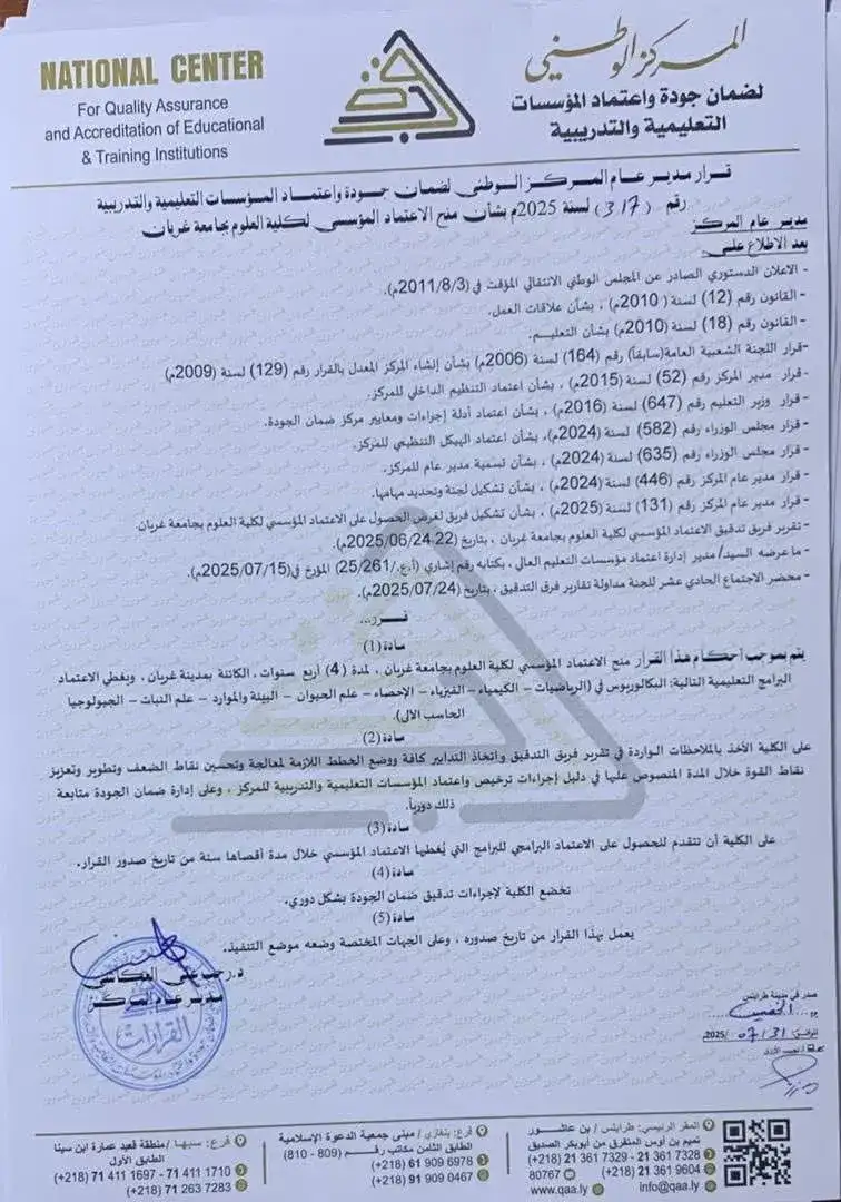بحمد الله وتوفيقه، وبفضل العمل الدؤوب والجهود المتفانية التي بذلها فريق الجودة بكلية العلوم، نُبشّركم بحصول كلية العلوم – جامعة غريان على الاعتماد المؤسسي من المركز الوطني لضمان جودة واعتماد المؤسسات التعليمية والتدريبية، وذلك لمدة أربع سنوات.