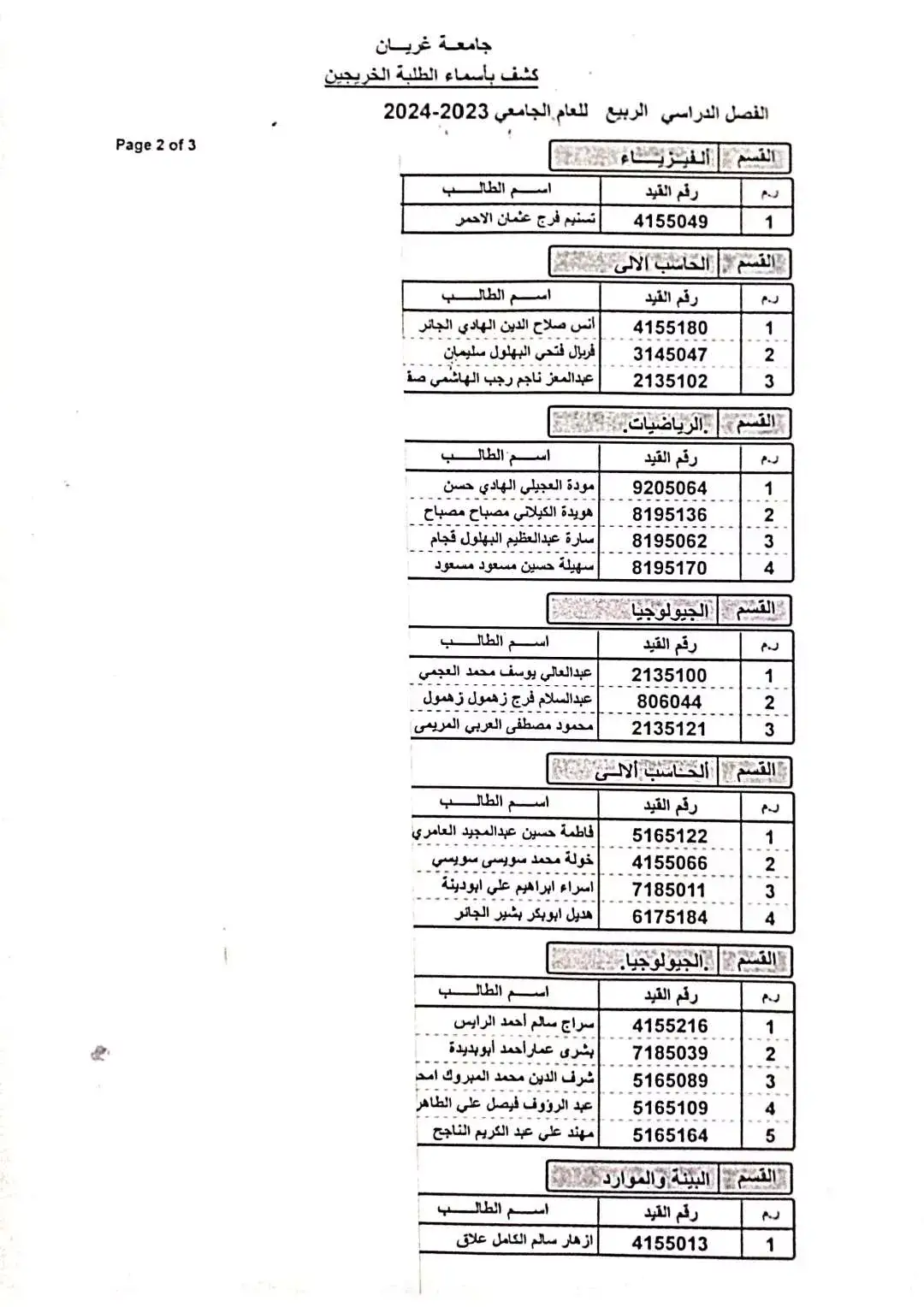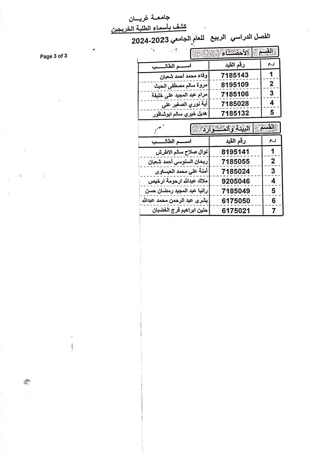 كشف بأسماء الطلبة الخريجين في كافة الأقسام بكلية العلوم غريان، الفصل الدراسي الربيع 2023-2024 مع أطيب الاماني